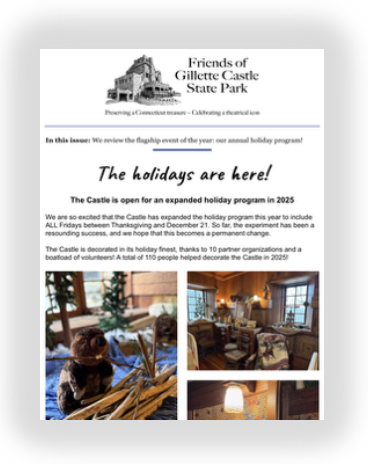 Founded in 1998, the Friends of Gillette Castle State Park is a nonprofit, all-volunteer organization that is dedicated to the preservation, conservation, and education of the Gillette Castle and its scenic grounds, located within the Seven Sister Hills along the Connecticut River. We are always accepting new members and welcome any donations. Follow the Friends of Gillette Castle State Park Facebook page for updates on various events and appearances. Contact us with any questions.